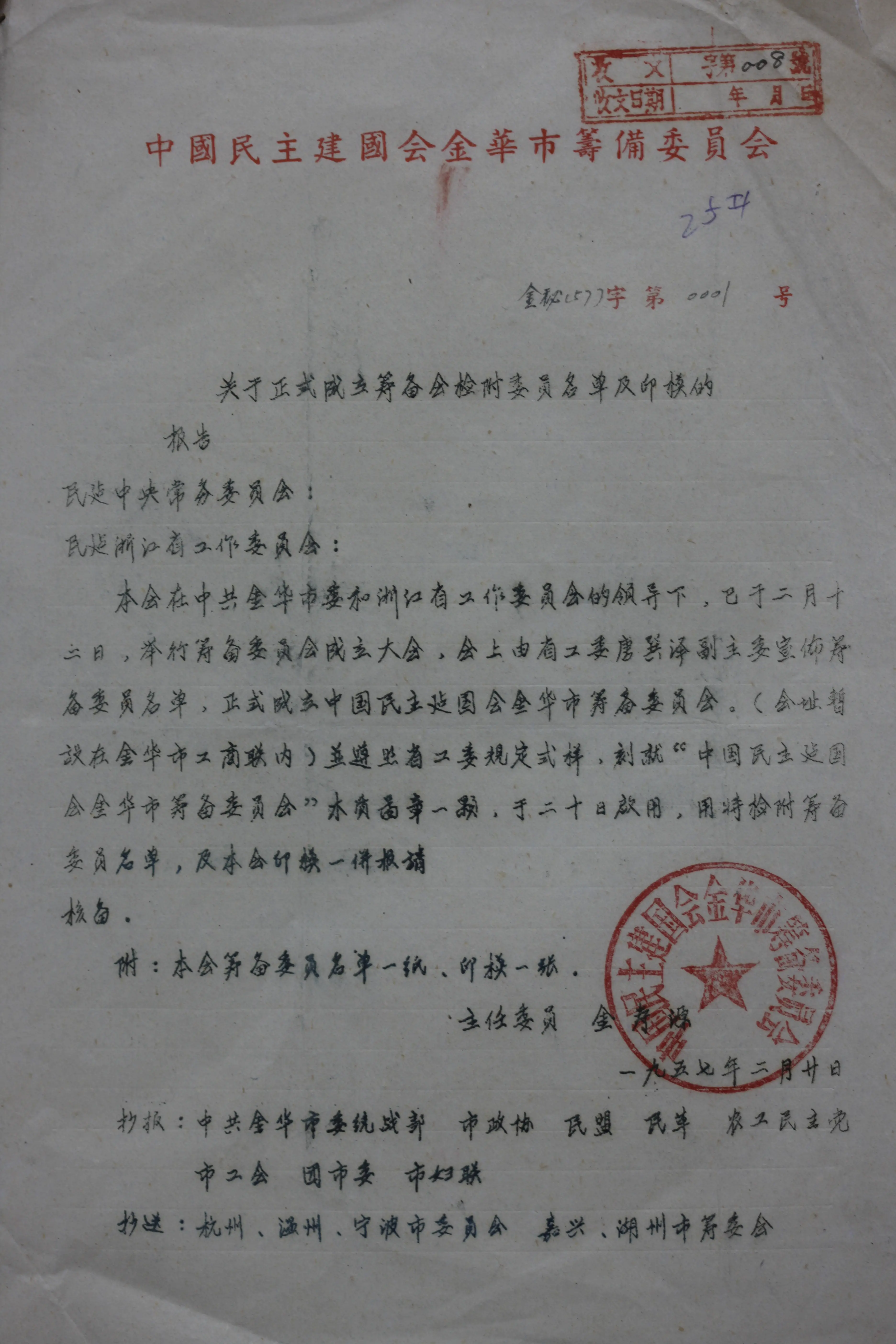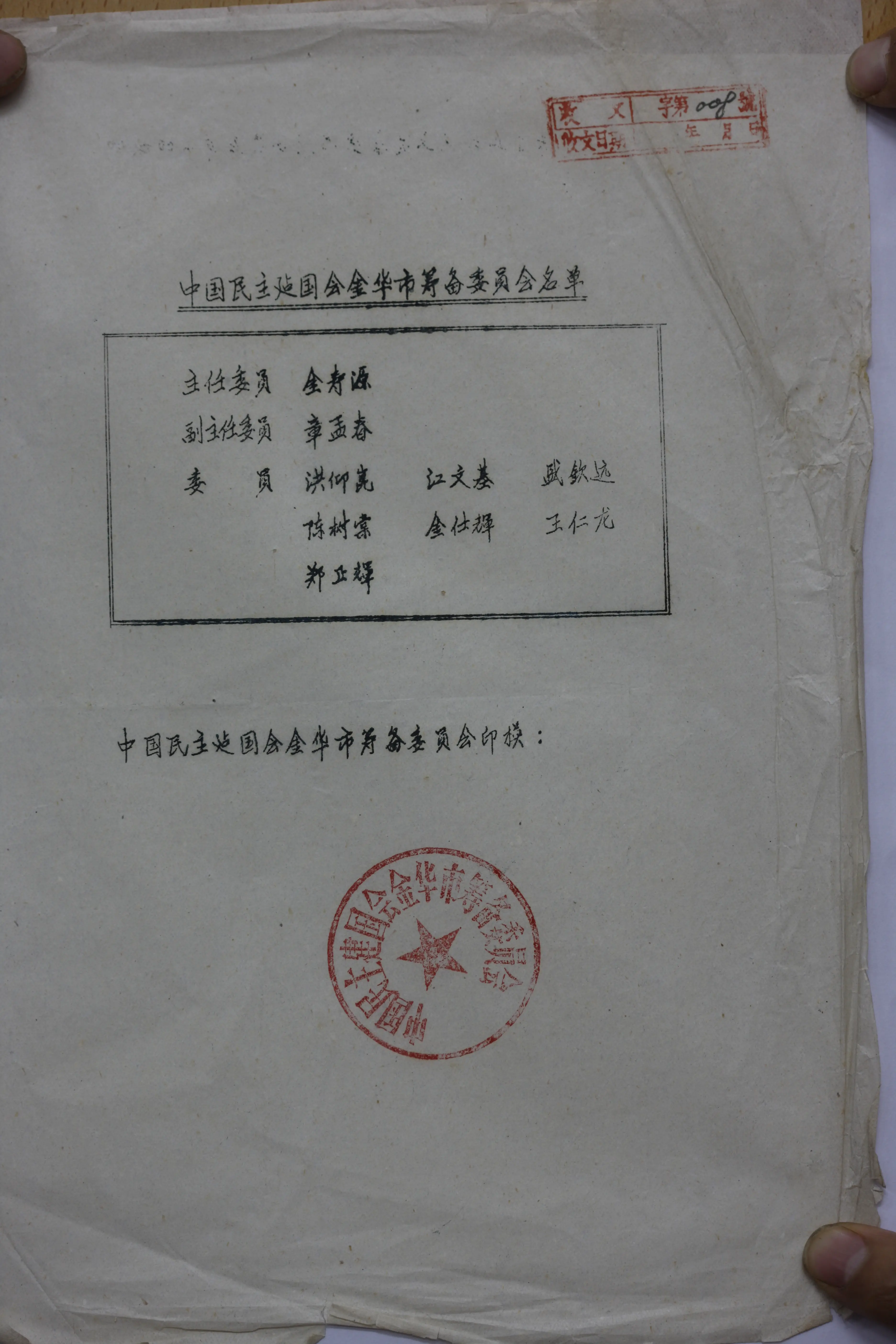 1956年2月,民建浙江省工作委员会副主委唐巽泽亲临金华,为筹建金华地方组织做准备,以私方人员中的骨干和代表人物为主体,开始在市区发展民建会员。这一行动得到了中共金华市委(县级市)的大力支持和市委统战部的有力帮助。