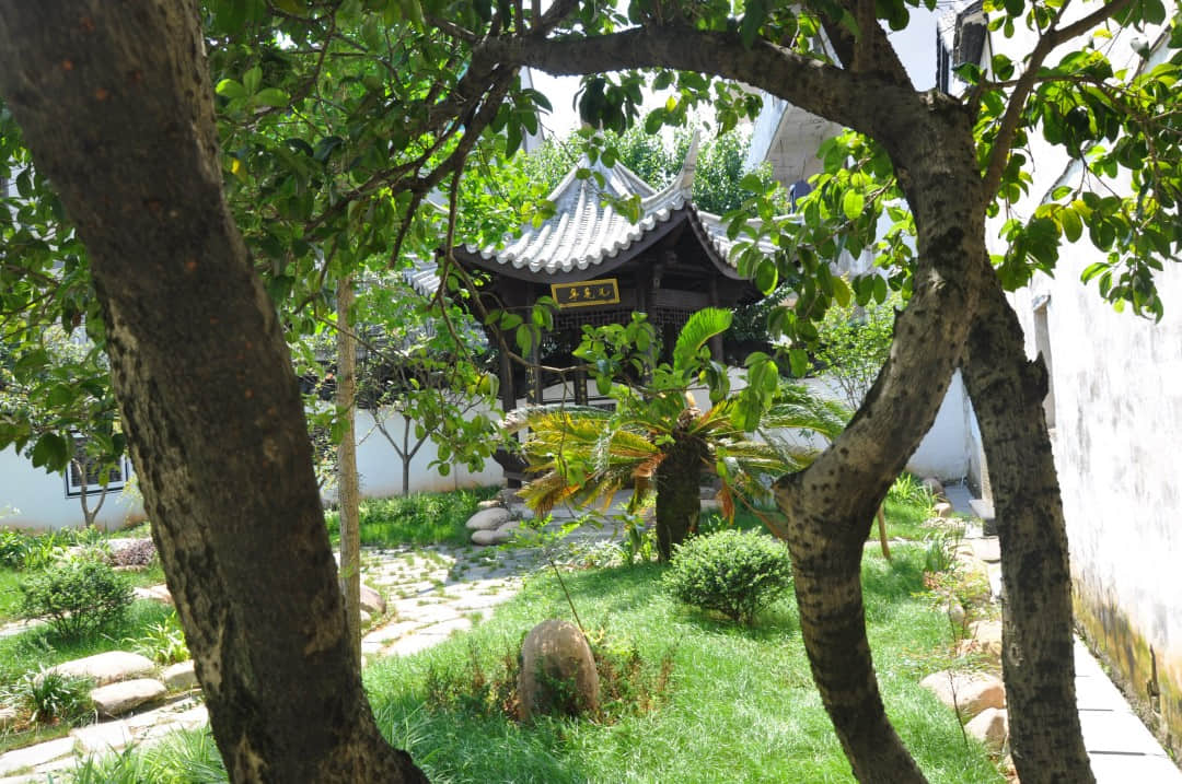 第一部分院子。左边是2015年修建的光亮亭,右边是施复亮、施光南雕塑。江南小院里栽有翠竹、香樟、棕榈、桃花等花木,保存有2015年时任民建中央主席陈昌智为施复亮故居民建中央爱国主义教育基地揭牌时所种植的石榴树一颗。