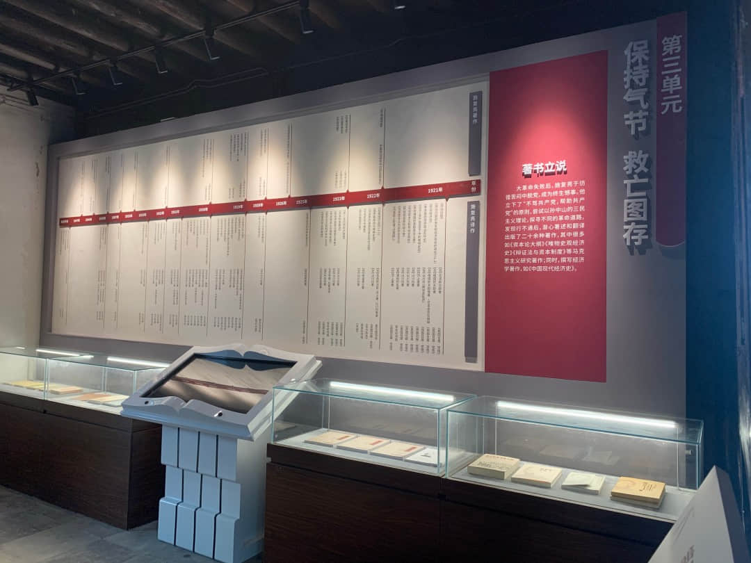 第二部分一楼厅堂。主楼主要以图片文字、遗物展示等为主,展示施复亮在建党、建团、发起成立民建等相关方面的主要事迹。与现在书房结合,展示施复亮著书译著、经济学作品成就及实物。书房和厨房,保存当年施复亮使用时的情形。