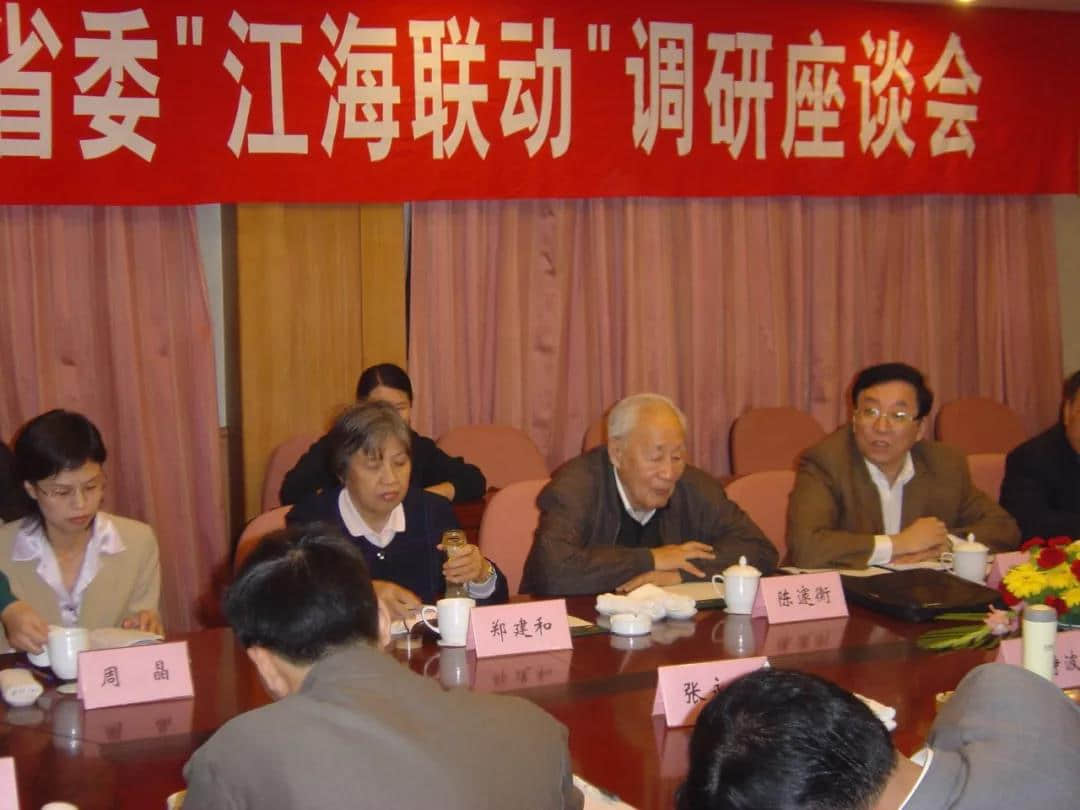 2004年10月,民建江苏省委名誉主委陈邃衡(右二)、主委赵龙(右一)带队在南通调研洋口港建设可行性。