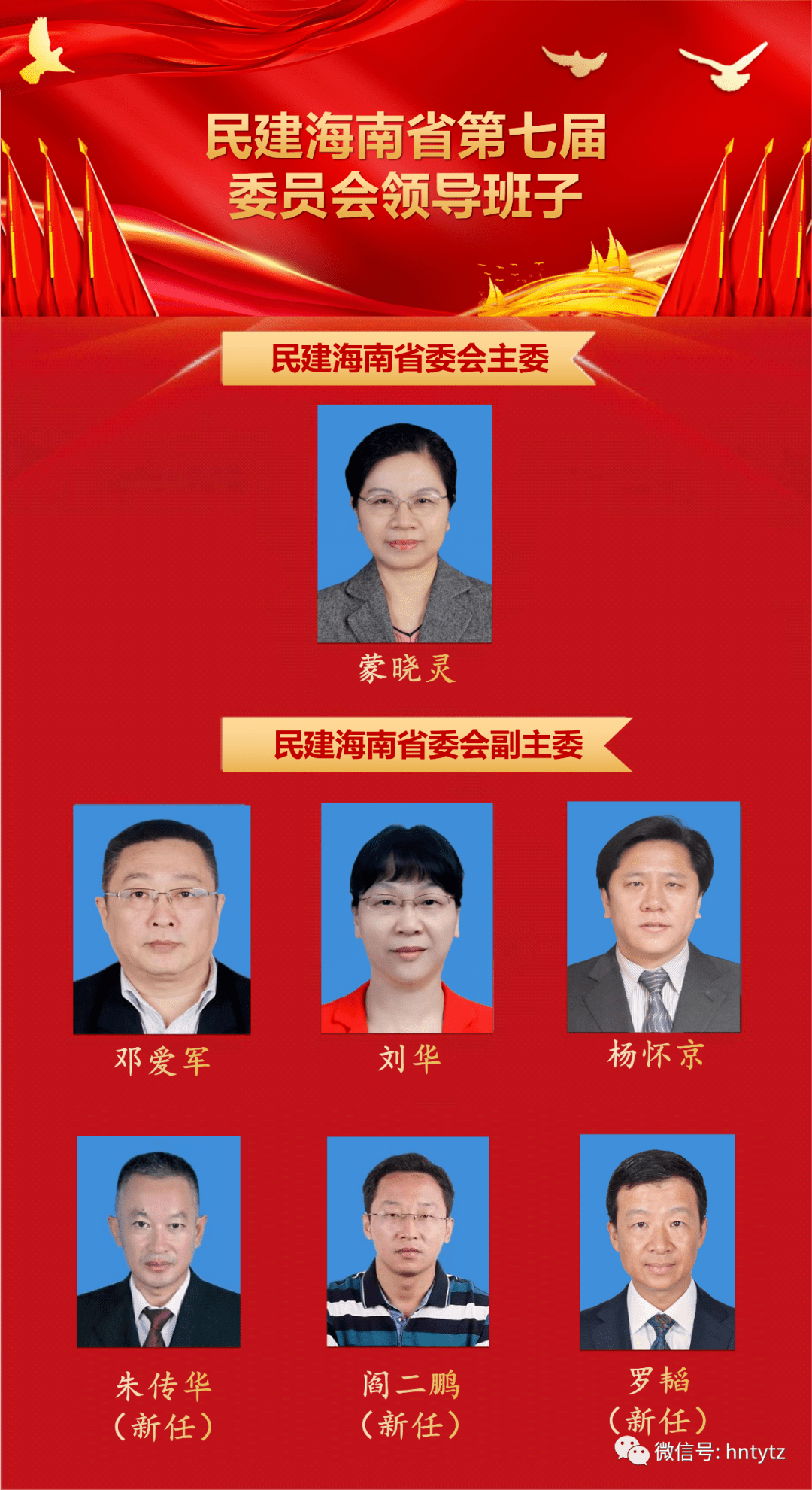 2022年6月30日,民建海南省第七次代表大会选举产生民建海南省第七届委员会,现有委员42人,其中主任委员1人,副主任委员6人,常务委员10人。现任主任委员:蒙晓灵,副主任委员:邓爱军(专职)、刘华、杨怀京、朱传华、阎二鹏、罗韬,秘书长:符永泉。民建海南省第七届委员会下设1个专责机构:民建海南省第七届委员会内部监督委员会,8个专门委员会:理论研究委员会、旅游文化委员会、经济委员会、法制委员会、妇女委员会、青年委员会、农业农村委员会、自由贸易港委员会。