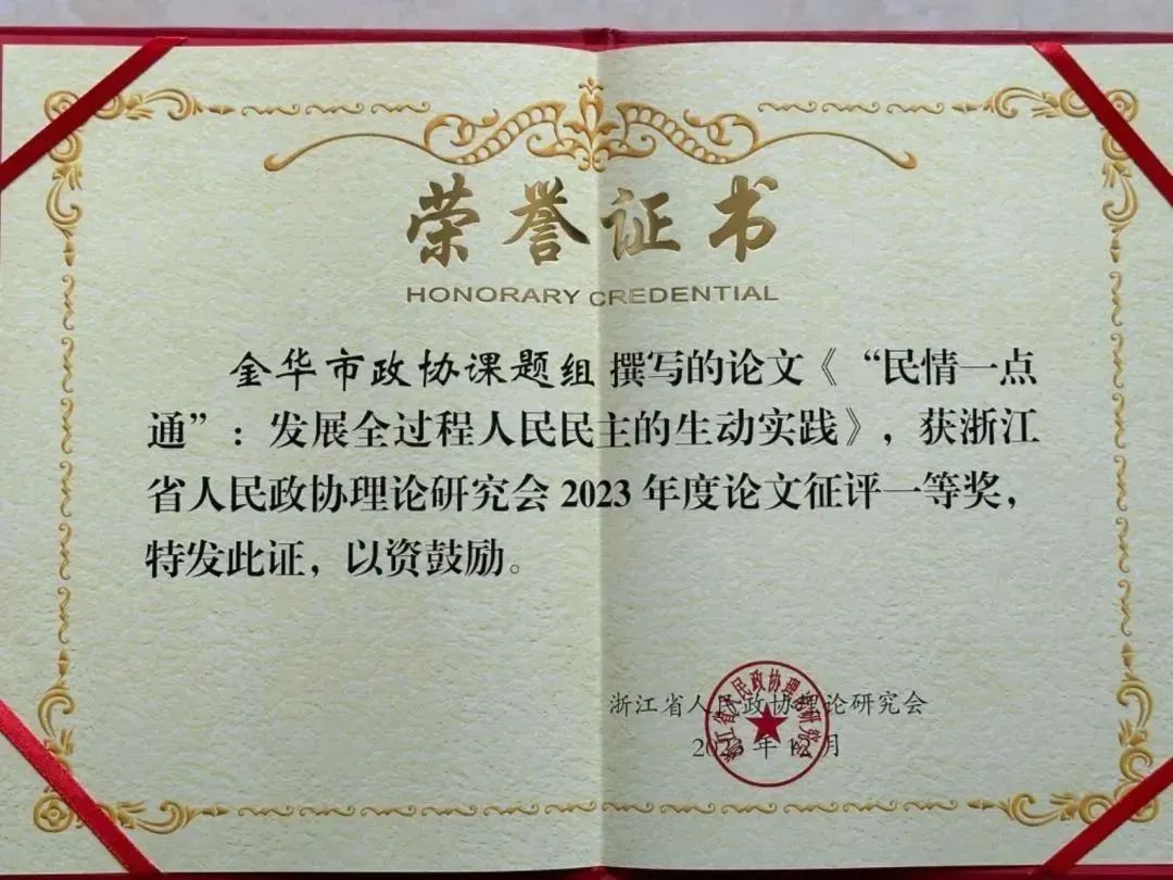 近日,从2023年省政协理论研讨会上传来喜讯,我市政协系统共有5篇论文获奖,其中金华市政协课题组的《“民情一点通”:发展全过程人民民主的生动实践》获一等奖。