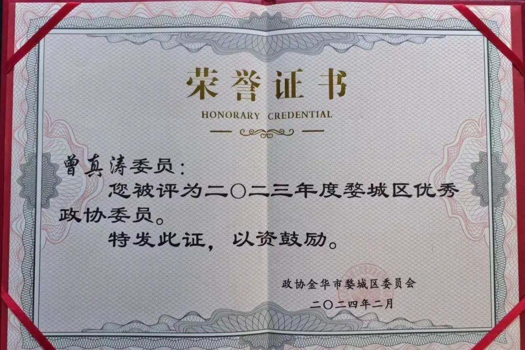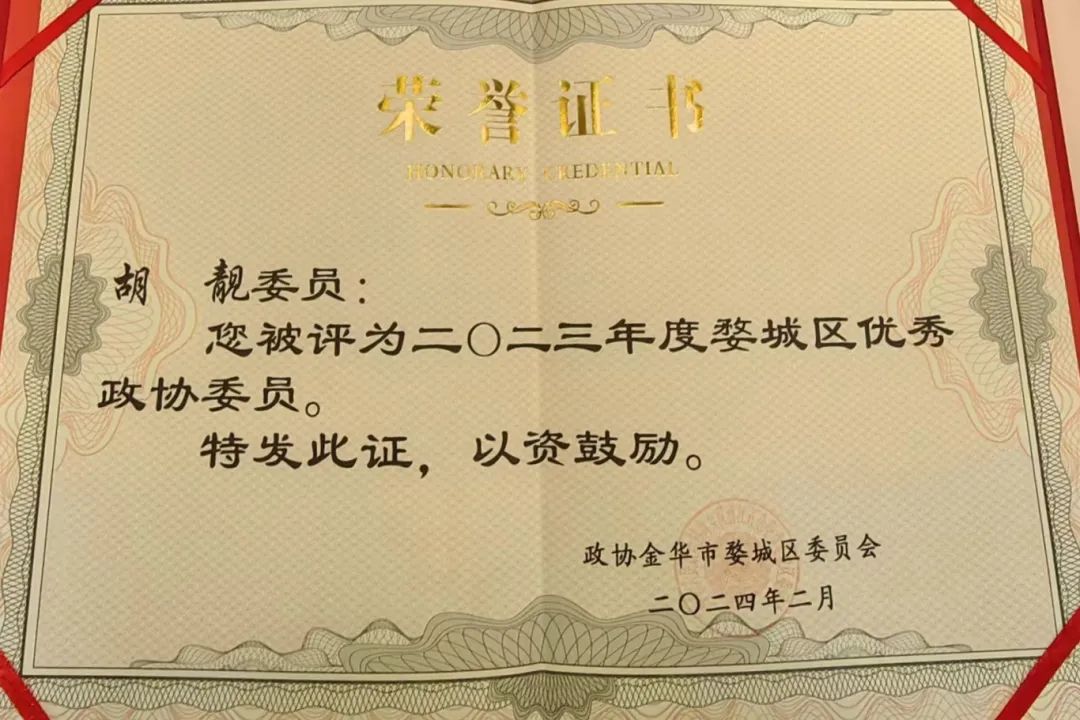 区人大常委、民建婺城区基层委副主委周卫中被评为2023年度区人大优秀履职代表;区政协委员、民建婺城区基层委委员郑威,会员胡靓、曾真涛被评为2023年度区优秀政协委员。