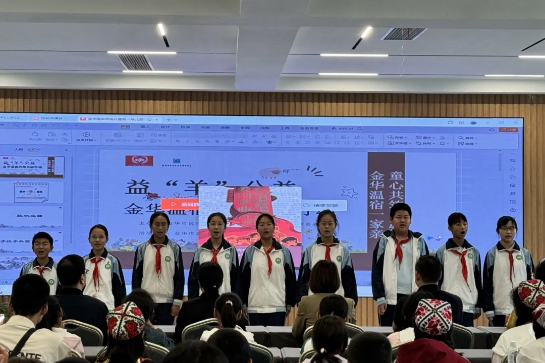 在浙江民建会员之家,来自源东乡中心小学的小朋友们为新疆温宿的小伙伴们献上了一首《在希望的田野上》。这首歌曲传递了孩子们对家乡的热爱和对美好新生活、新时代的赞美。台下,来自新疆的孩子们听得津津有味,纷纷用双手随着节奏打起节拍。