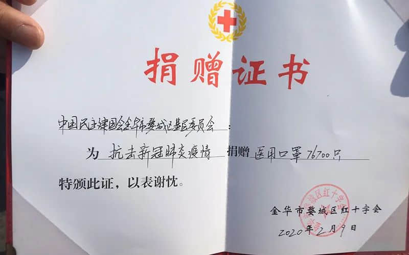 雷永金带领婺城民建疫情期间捐赠口罩7万余个