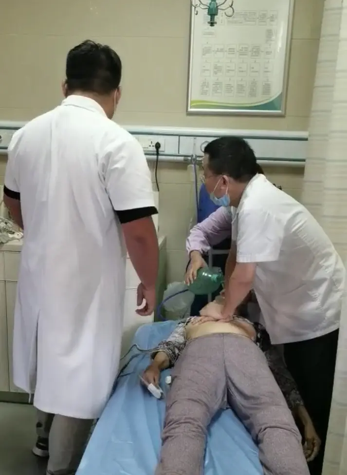 “判断无意识、呼吸、颈动脉搏动。”经过评估,方文宾判定患者心脏骤停,当即予以心肺复苏并启动应急预案。正在名中医工作室门诊的金华市人民医院潘兴城医生也加入了抢救团队。