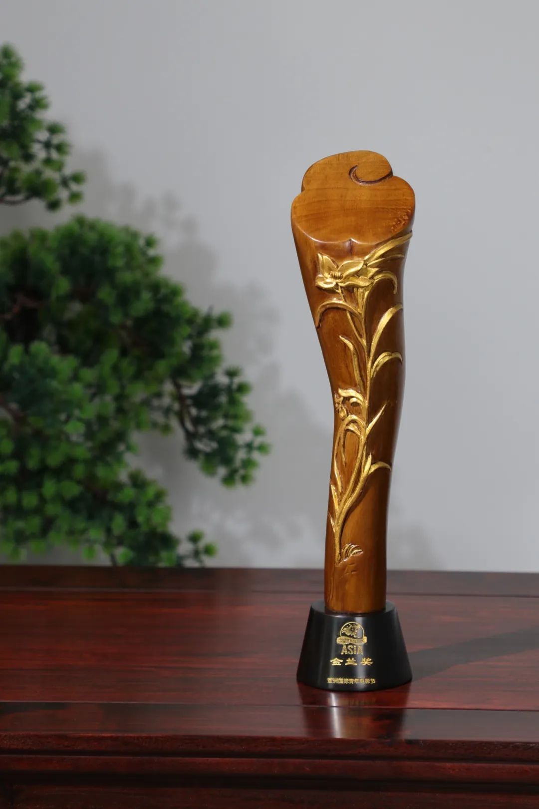 奖杯用金丝楠木打造,长条状,流线型,表面雕刻了一株金色兰花,采用东阳木雕的浮雕工艺。