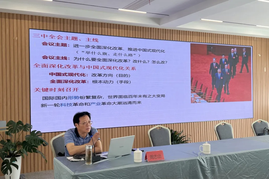 会上,浙江师范大学马克思主义学院原院长、博导、中国国际共产主义运动史学会理事、省科学社会主义学会副会长周志山教授围绕《进一步全面深入改革,推进中国式现代化》这一主题给会员们带来一场精彩纷呈的专题讲座。他从深刻把握党的二十届三中全会确立的主题和目标,到深刻领悟新时代全面深化改革的伟大历史成就、深刻领悟全面深化改革的新思想新观点新论断、深刻领悟全面改革的总体要求与系统部署等三方面,对全会精神进行了全面阐述。他特别强调了《中共中央关于进一步全面深化改革、推进中国式现代化的决定》中的核心内容和精神实质,给会员们带来宝贵的启示和深刻的思考。
