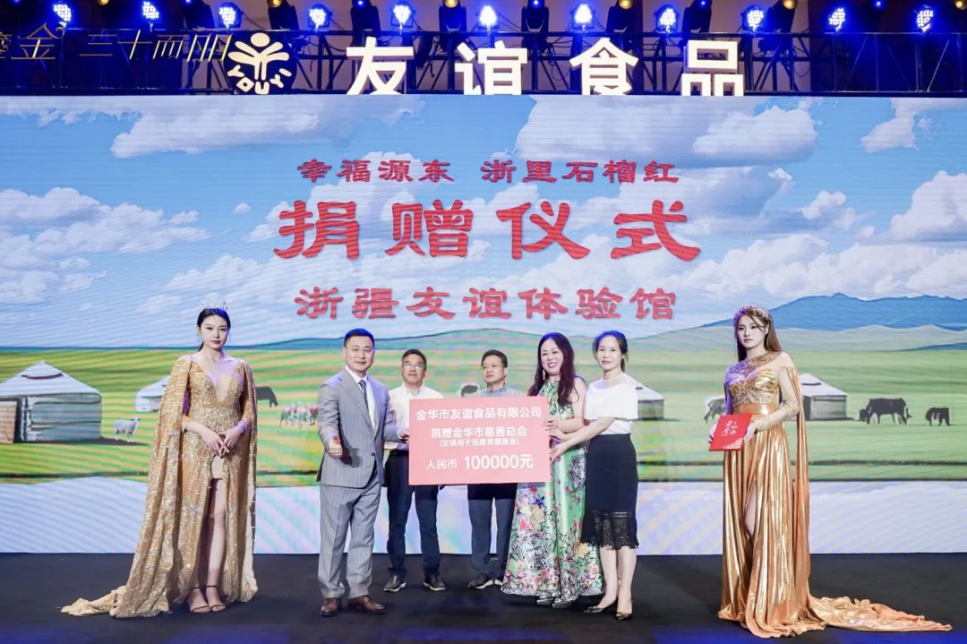 近日,在金华民建会员企业金华市友谊食品有限公司30周年庆典上,民建会员、友谊食品总经理邵莉娟向市慈善总会捐赠10万元,用于“幸福源东·浙里石榴红·浙疆友谊体验馆”毡房建设。