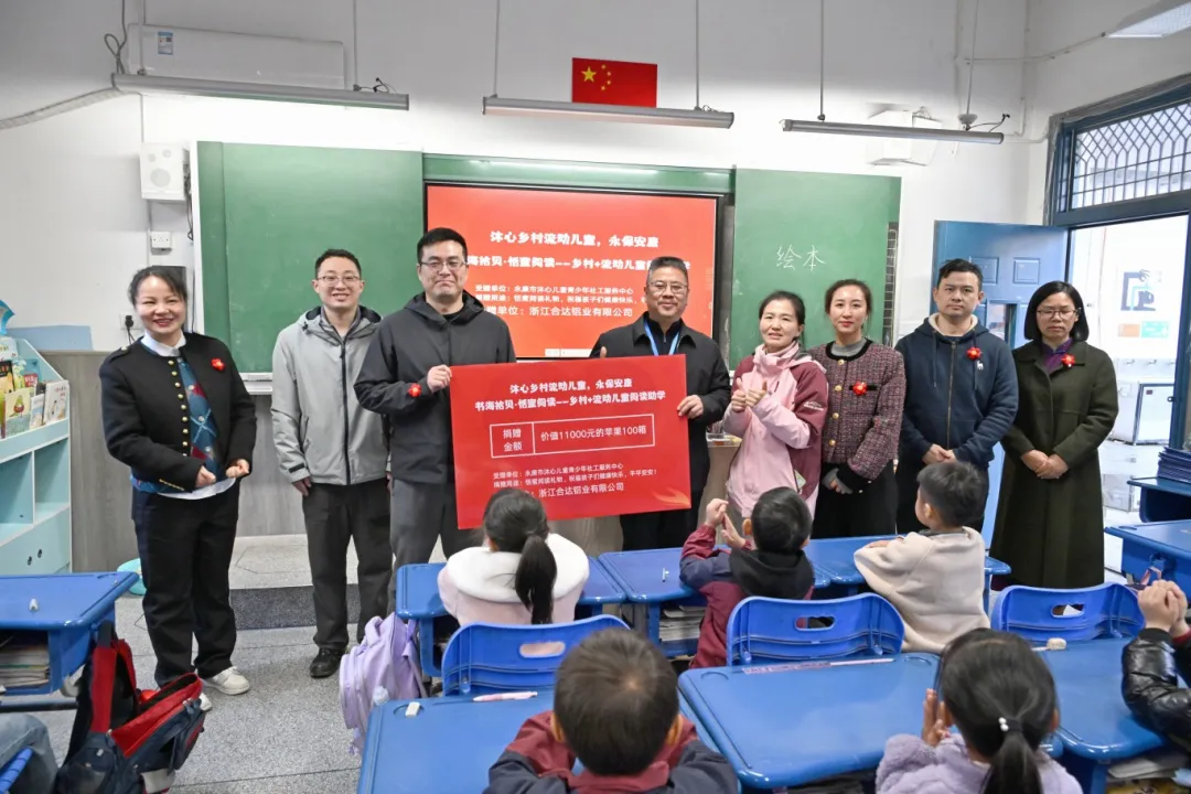 民建永康市基层委为四路小学捐赠图书(价值1万元)。潘梨儿在致辞中表达了对孩子们的殷切关怀,希望捐赠的书籍能够陪伴孩子们健康成长,并表示未来会创造更多机会,支持孩子们的阅读梦想。