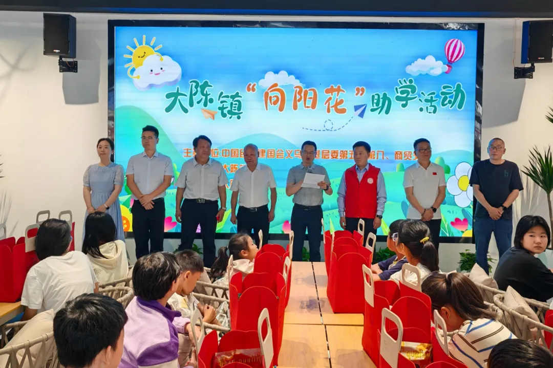 5月26日,临近六一,民建义乌市基层委第五支部、第八支部、商贸支部携手大陈镇妇联、侨联,在大陈小集共同举办了“向阳花”助学活动。义乌市人大常委会副主任、民建义乌市基层委主委鲍建锋,基层委秘书长邹华忠,委员金永昌、孙兵、吴雪峰,义乌民建会员代表及大陈镇相关领导和妇联、侨联的热心人士齐聚一堂,共襄爱心盛举。
