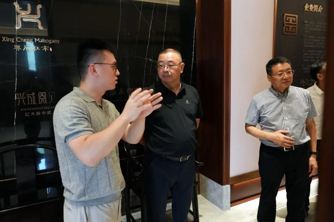 随后吴立军一行考察了会员企业东阳市兴成红木家具有限公司,参观了新中式红木精品馆、红木整装馆等产品展示空间,深入了解东阳红木家具产业发展现状以及方向,针对新生代民建企业家运用短视频等新媒体手段,致力传承红木文化与现代红木整装需求的深入融合,推动传统红木家具产业转型升级的行为表示高度肯定。