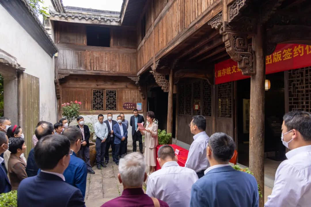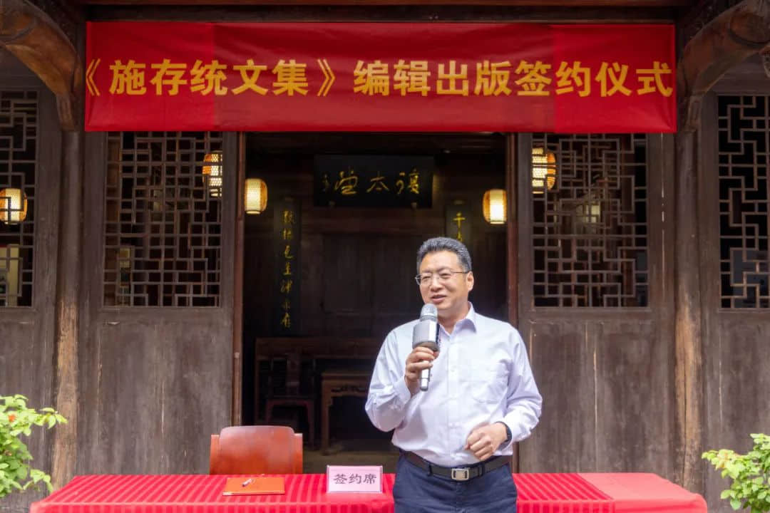 市政协副主席、民建市委会主委杨坚明对《施存统文集》的编辑出版签约表示祝贺。他指出,施复亮的一生是不断探索、追求真理、无私奉献、矢志报国的一生,他经历丰富,充满传奇,可供我们学习的地方很多。一是要学习好。施复亮先生就是一个好的学习模范,好学钻研的模范,革命创新的模范,勤勉敬业的模范,家庭生活的模范,这些都值得我们学习借鉴。二是要传承好。百年风云见证了中国共产党的伟大,我们要传承好先贤的爱国情怀、优良作风、奋斗品格、奉献精神,不断坚定“跟党走、听党话”的政治信念。三是要践行好。在参加民建省第十次代表大会前夕,我们金华代表来到施复亮故居,不仅是出发动员,更是精神洗礼,以更加饱满的精神参加大会,把会员的心声带上来,履行好代表职责。四是要宣传好。东叶走出了施复亮,是我们的荣幸;把先贤精神传承好,把先贤故事讲好,是我们的责任。市直四支部《一枚图章》就是一个很好的尝试,展现新一代民建人的一份心、一份情、一份爱。感谢社会各界对民建工作的大力支持和帮助,希望通过大家的努力,共同把东叶村打造成为爱国主义优良传统教育基地、乡村振兴共同富裕实践基地、价值理念精神文化共享家园,成为民建会员铭记先贤初心,传承优良传统的重要载体。
