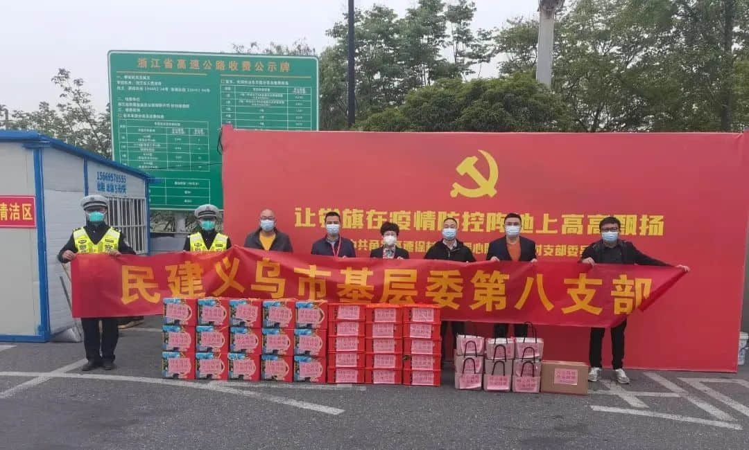 4月18日,民建义乌市基层委第八支部在基层委副主委何俊、秘书长邹华忠、委员孙兵及八支部主委冯沾钱的带领下,将水果、牛奶、饼干、八宝粥等慰问物资送到值守在义乌徐村高速路口的工作人员手中,向夜以继日坚守“疫”线工作者致以崇高的敬意和亲切的问候。