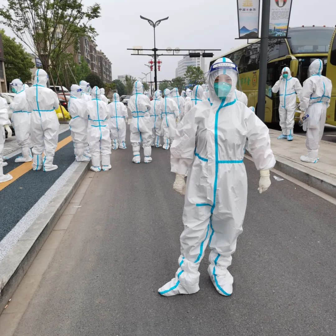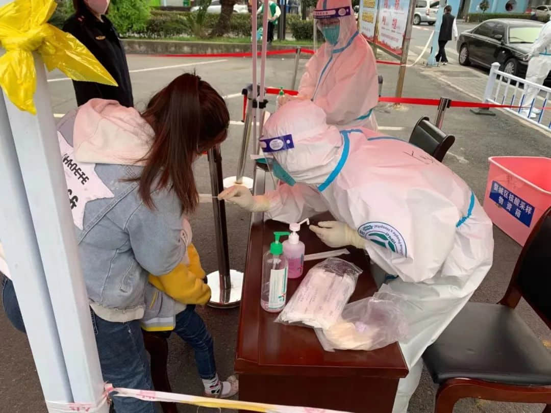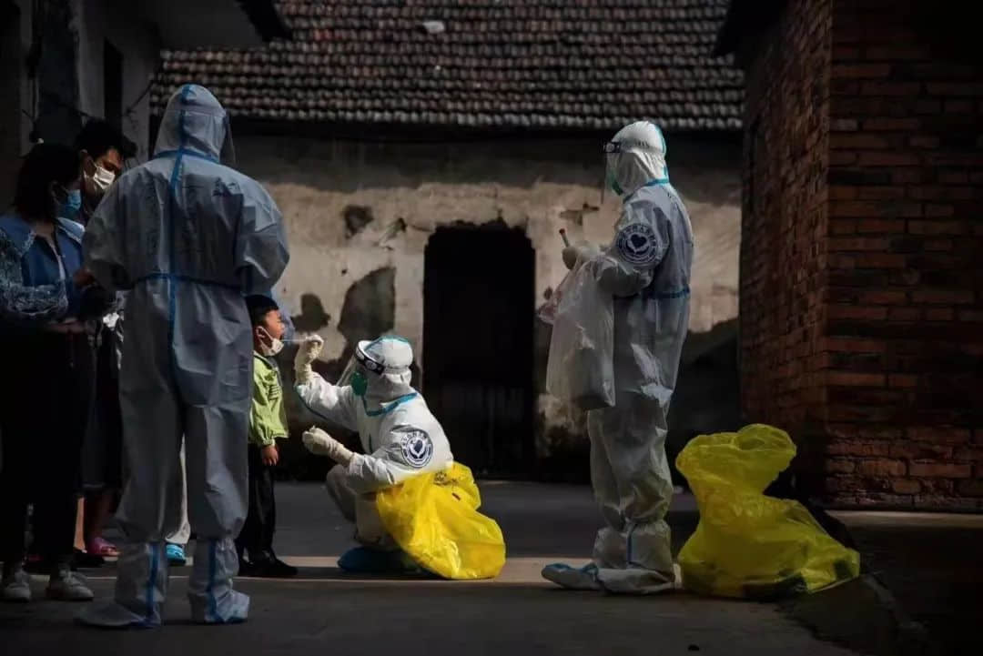在封控区现场核酸检测采样的顾磊,每次采样需要十几个小时,穿着严密防护服的她,不吃不喝,每个小时采样100多个。