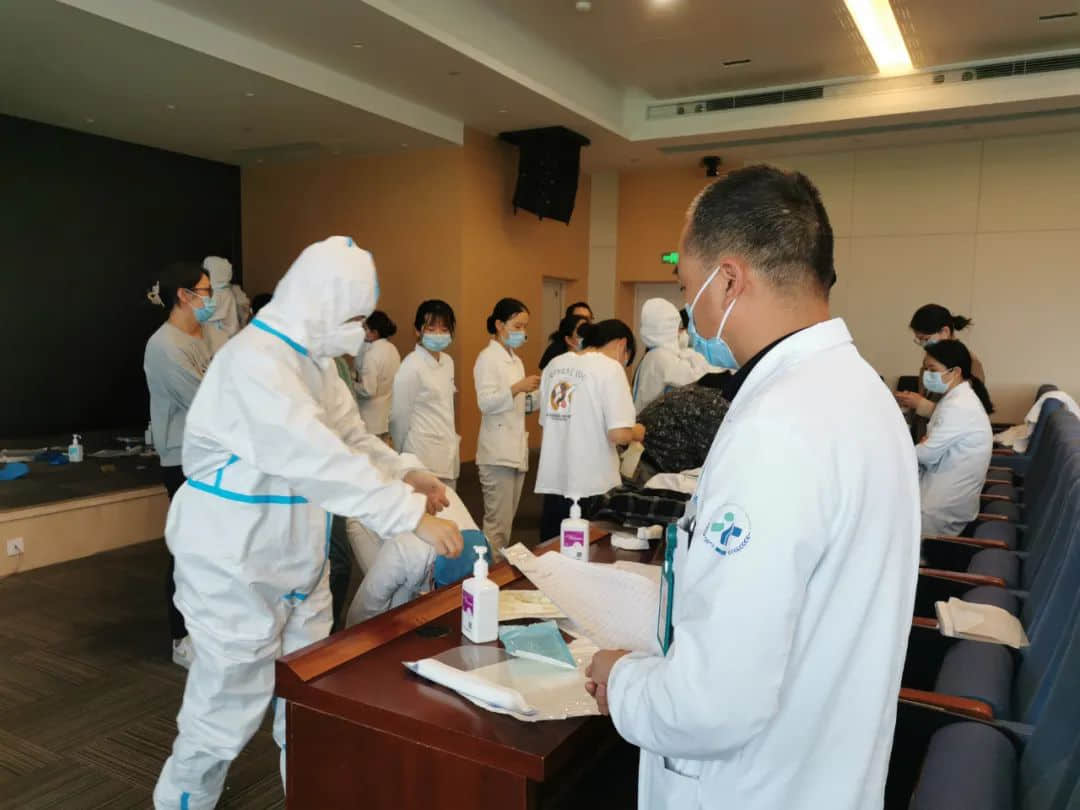 许健波,金华市中心医院检验科主任,在金华市妇幼保健院,培训核酸采样人员。