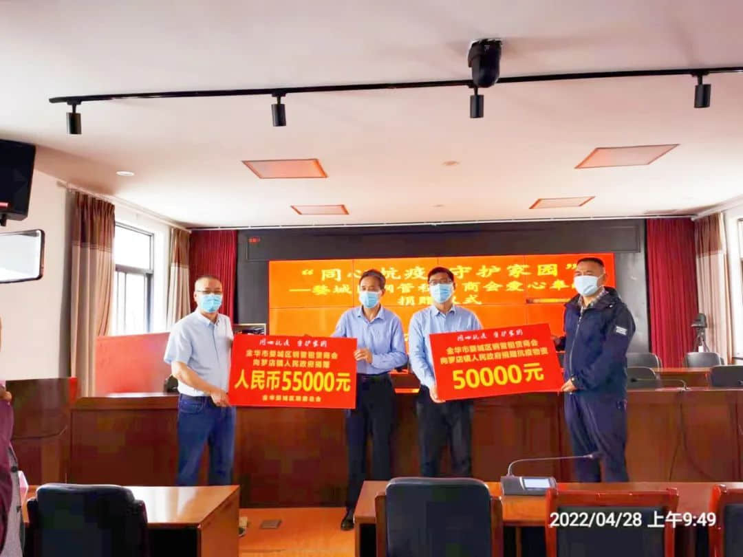 4月28日上午,金华市民建企业家联合会常务副会长范振翔带领钢管协会会员单位,通过区慈善总会定向罗店镇人民政府捐赠现金55000元,抗疫物资50000元。