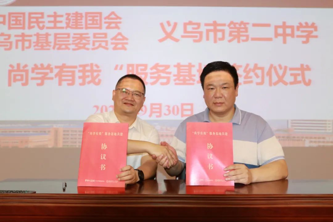 随后,义乌民建与义乌二中签订了共建协议书,并共同为“共建单位”揭牌。