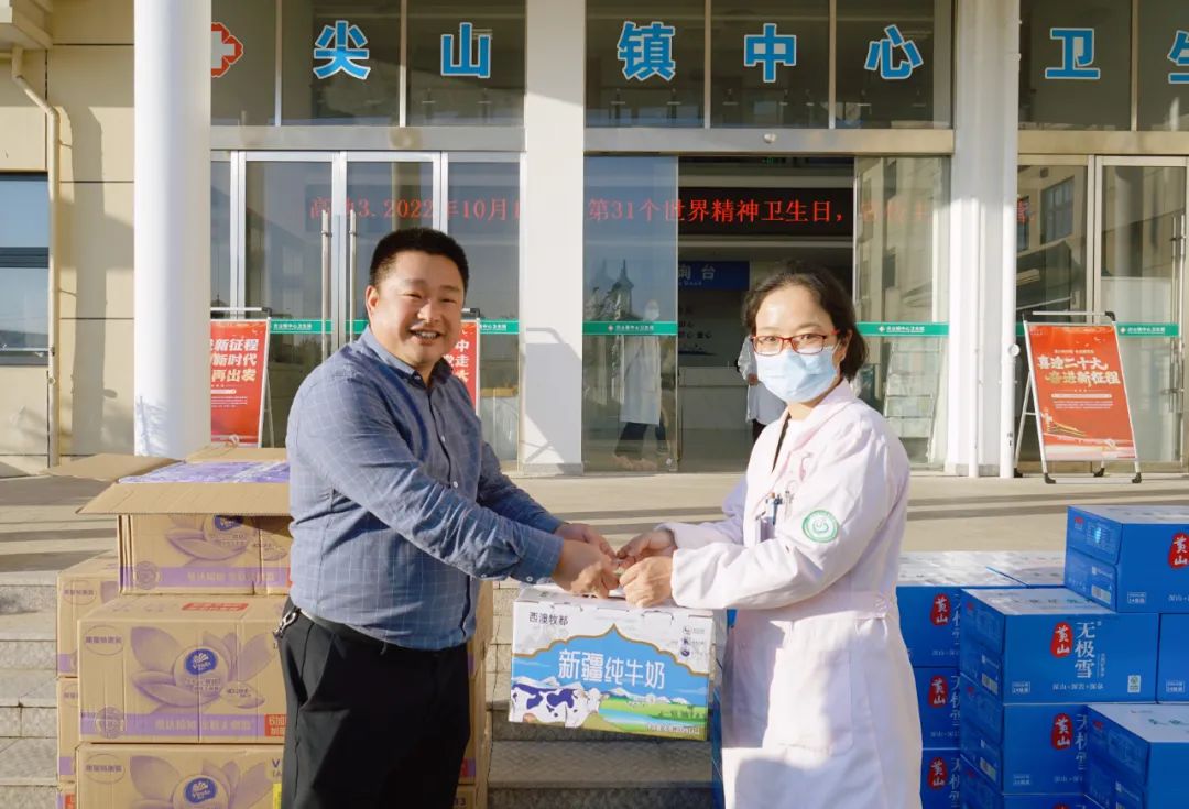 随后企业会员、浙江凯越塑胶有限公司总经理厉向晖给医护人员送上由浙江凯越塑胶有限公司和浙江启隆卫浴有限公司共同提供的牛奶、矿泉水、纸巾等慰问物品。