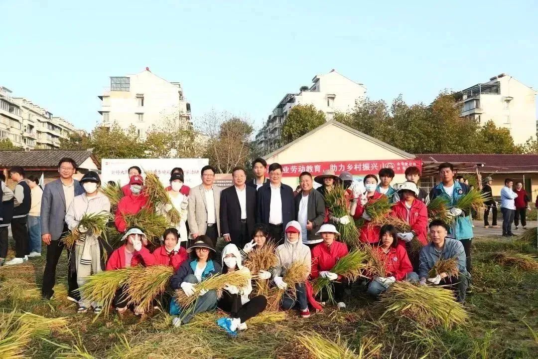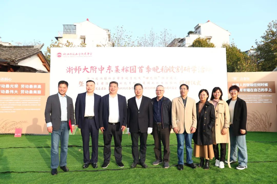 11月21日,浙师大附中东莱稼园举行了首季晚稻收割研学活动暨捐赠仪式。浙江师范大学党委副书记、校长蒋云良,金华市政协副主席、民建市委会主委杨坚明,金华日报党委副书记、总编辑范卫东,副总编辑俞平,浙师大直属学校与合作办学管理处处长叶志雄,民建婺城区基层委主委兼附中劳动教育技术总指导丰群飞等领导以及婺城民建代表出席仪式。