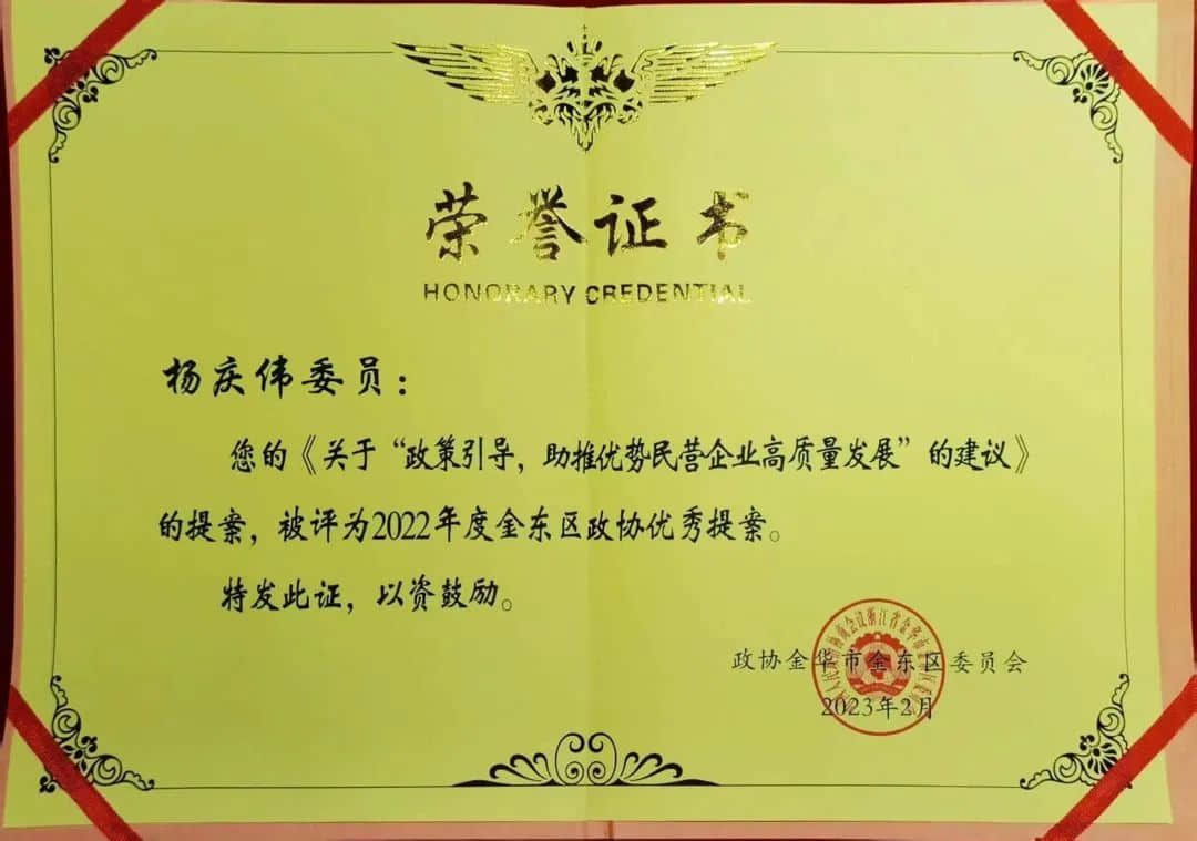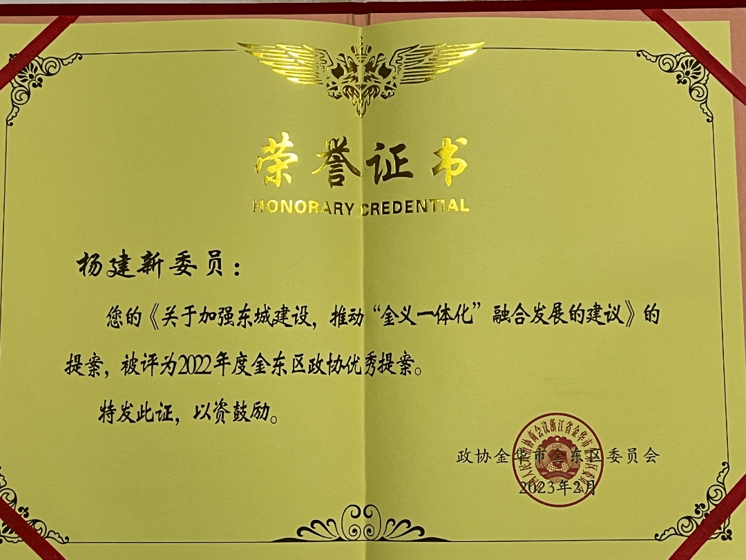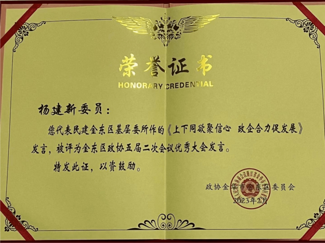 会议表彰了先进,民建硕果累累。杨庆伟被评为2022年度优秀政协委员。杨庆伟《关于“政策引导,助推优势民营企业高质量发展”的建议》,杨建新《关于加快东城建设,推动“金义一体化”融合发展的建议》等2件提案被评为2022年度金东区政协优秀提案。王莹《关于“双减”背景下促进农村学校教育减负提质的建议》,何志云《关于加快全区乡镇卫生院建设的建议》,杨华芳《关于要求建立农村人居环境整治长效管护机制 擦亮乡村振兴底色的建议》等3件建议被评为2022年度区人大优秀代表建议。