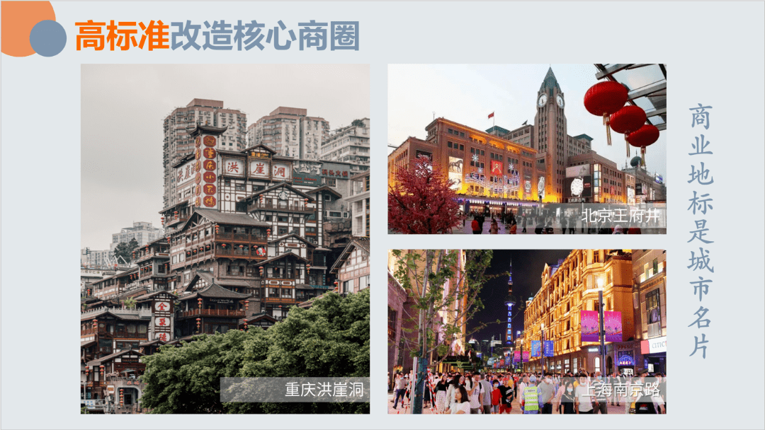 高标准改造核心商圈。商业地标,是一座城市的形象代言人。东京有银座,香港有铜锣湾,北京有王府井,温州还有个五马街,我们金华的商业地标在哪里呢?市区虽然有西市街和宾虹路两个商圈,但这么多年过去了,变化不大,迫切需要重新规划布局,加速改造提升。江北西市街商圈历史悠久,底蕴深厚,虽然有一百、银泰、永盛、恒大,但互不联通,客流循环不起来,消费体验较差。建议从人民广场地下停车场改造入手,打通几大商场的地下空间,同时把人民广场改造成潮流市集,将解放东路的夜市搬过来,让人气聚起来、商圈旺起来。江南宾虹路商圈现有银泰、一百、世贸中心等,在此基础上,建议放大轻轨枢纽优势,将金华商城地块作为江南的商业新地标来打造,成为引领未来的高品位商圈。