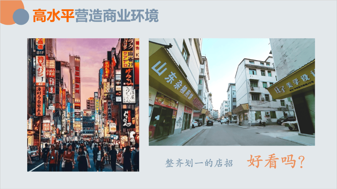 高水平营造商业环境。商家普遍反映生意难做钱难赚,除了电商替代和疫情影响外,有的部门管得太多太死也是一个原因。如有个老板开超市,房租交了,店面装修好了,结果说房子不是商业用途,消防许可证做不出来,几百万的投资打了水漂。相关部门能不能在审批时就给个清单,让人明明白白?再比如停车问题,有的市民停车吃个早餐,罚单就跟来了,“50元的包子”,“150元的面条”,吐槽的就是停车难、罚单多。执法能不能人性化一点,多一些宽容,少一些罚款?建议借鉴上海、杭州的做法,非主干道路边停车,规范有序就不贴罚单,或者以告知单代替罚单,让城市多一些人情味。关于店招设置问题,有的街区千篇一律,怎么看怎么不舒服。招牌既是商家的识别标志,也是一座城市的文化展现。有个性、有颜值的店招,更能体现城市的多姿多彩。
