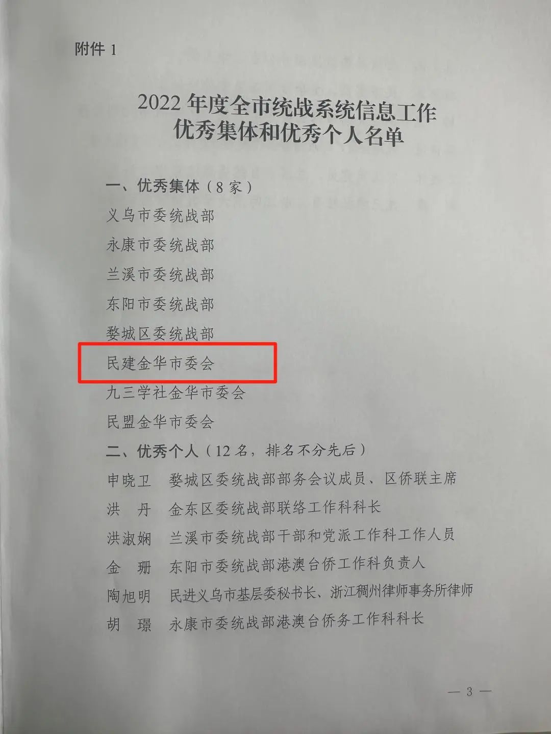 喜报!民建金华市委获全市统战系统信息工作优秀集体,一位会员获优秀个人