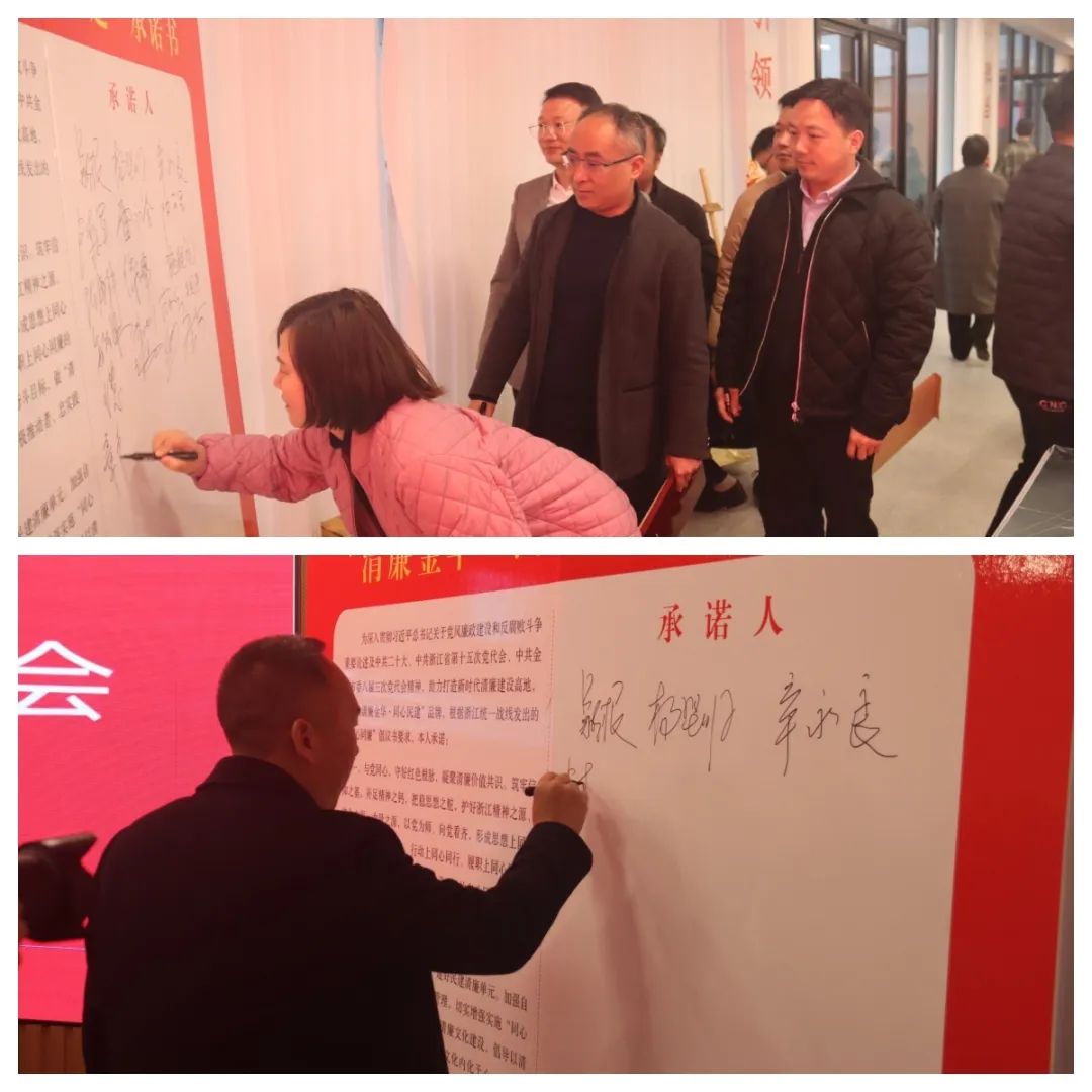 为响应浙江统一战线提出实施“同心同廉”工程的号召,民建市委会提出“清廉金华 同心民建”的倡议,参会企业家们轮流上台在承诺书上签字。