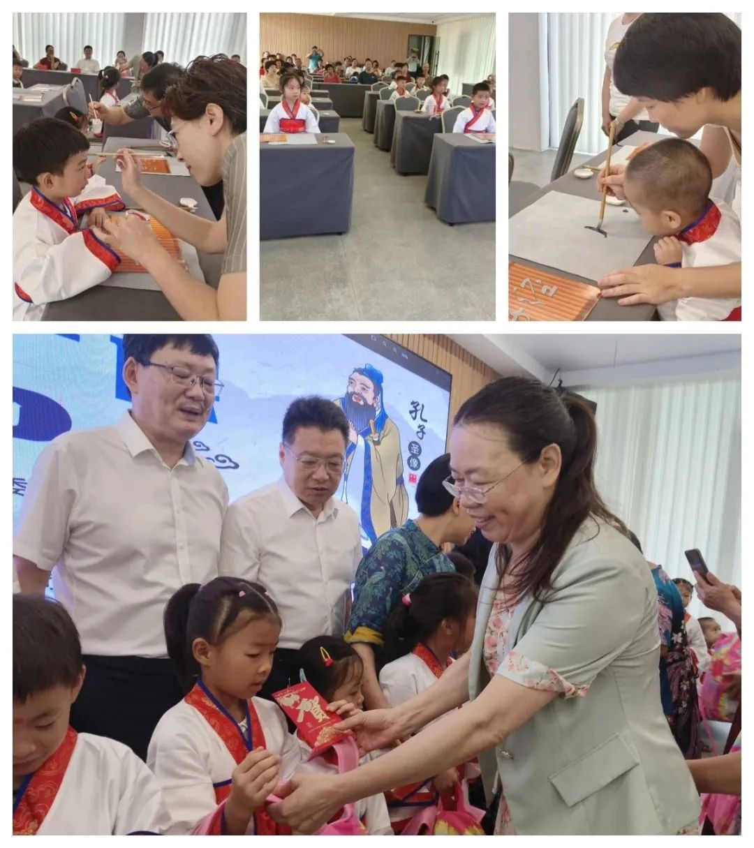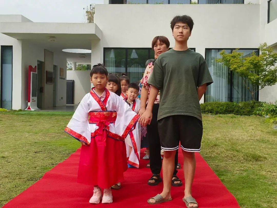 学识渊博的教授们为新生们点上象征着启智慧的鲜红朱砂痣。伴着“咚咚咚”的鼓声,新生们全体起立,共同吟诵《誓词》。最后在笔笔入心的“人”字书写中正式开启了自己的求学之路。在仪式结束后,浙师大基层委为东叶村16名即将入读一年级的新生们送上学习用品和红包,代表们亲切地勉励新生们勤奋好学,健康快乐成长。